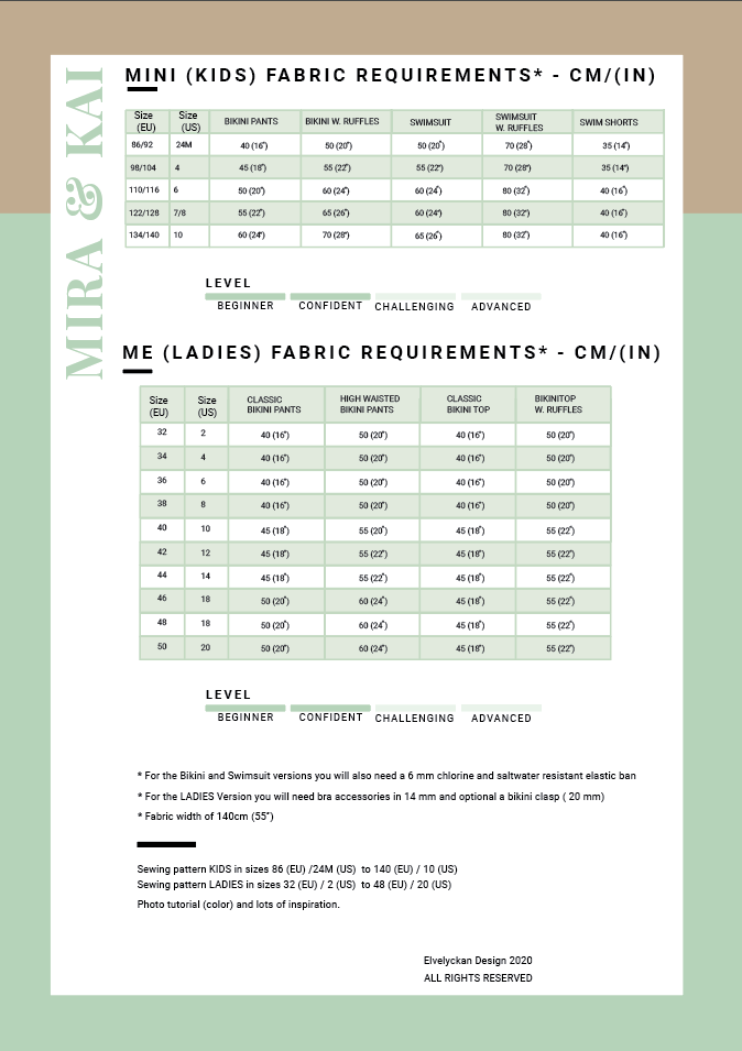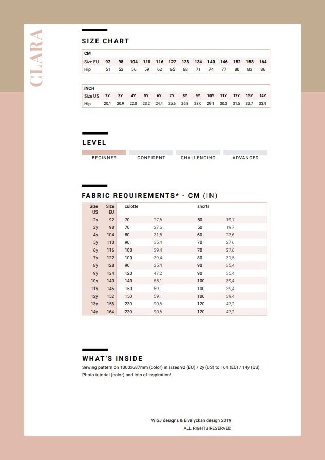 Also included is cutting-, size- & measurement guide but also fabric requirements.