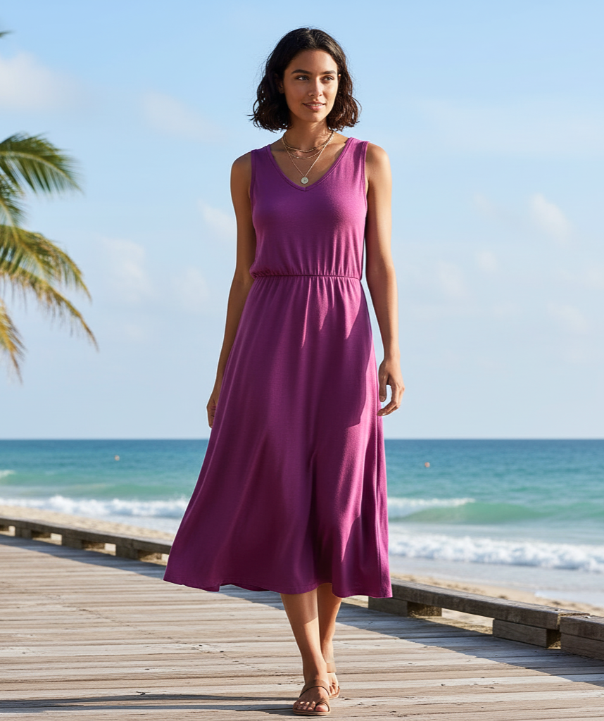 A staple in ready-to-wear collections, this fabric is widely used in fashion retail thanks to its comfort, flow, and flattering fit.