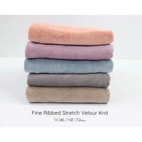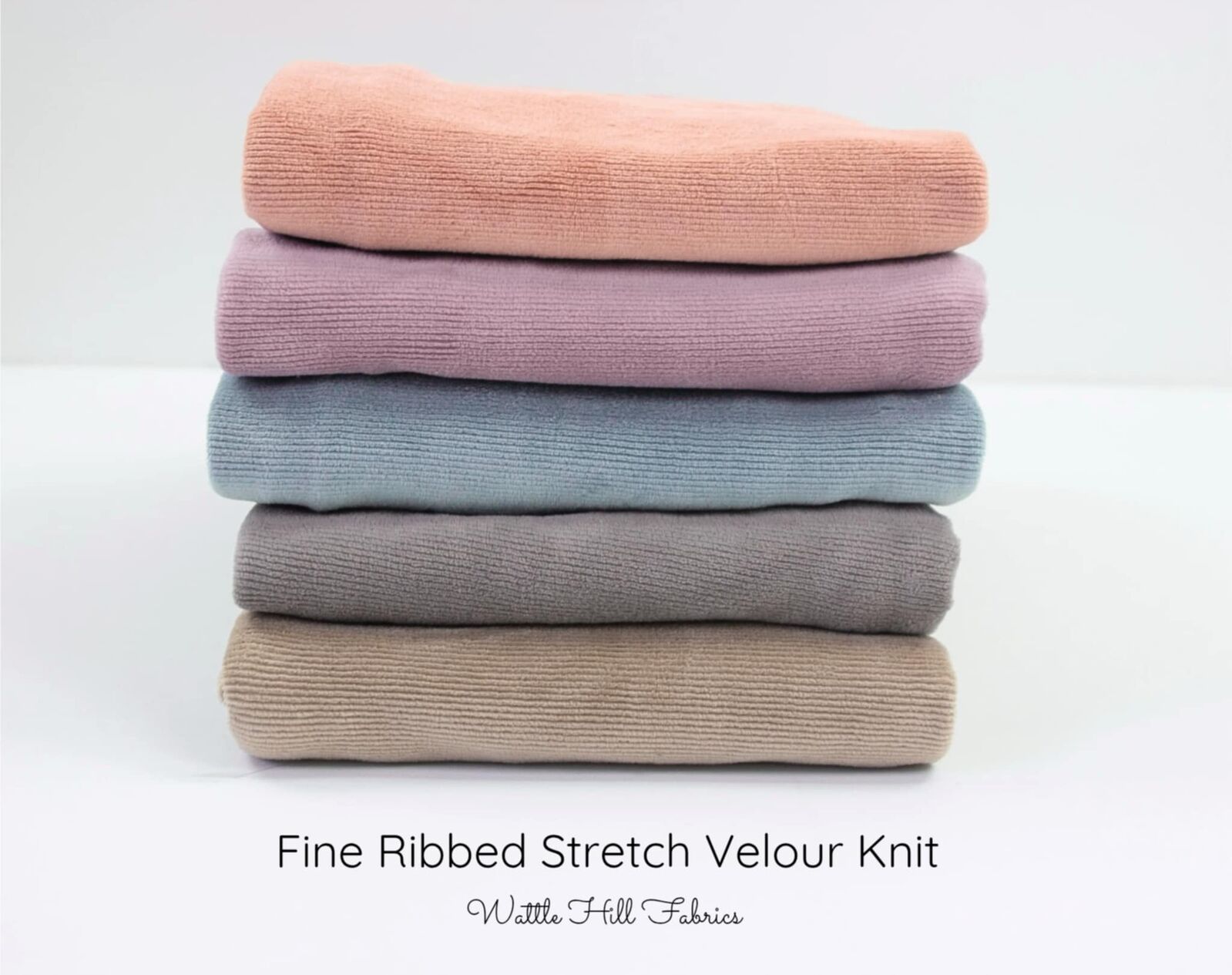 This fine ribbed stretch velour knit is ultra soft, comfortable and very stretchy in both directions. With its subtle ribbed texture (running horizontally) and high elastane content, it's perfect for creating garments that need both style and comfort.