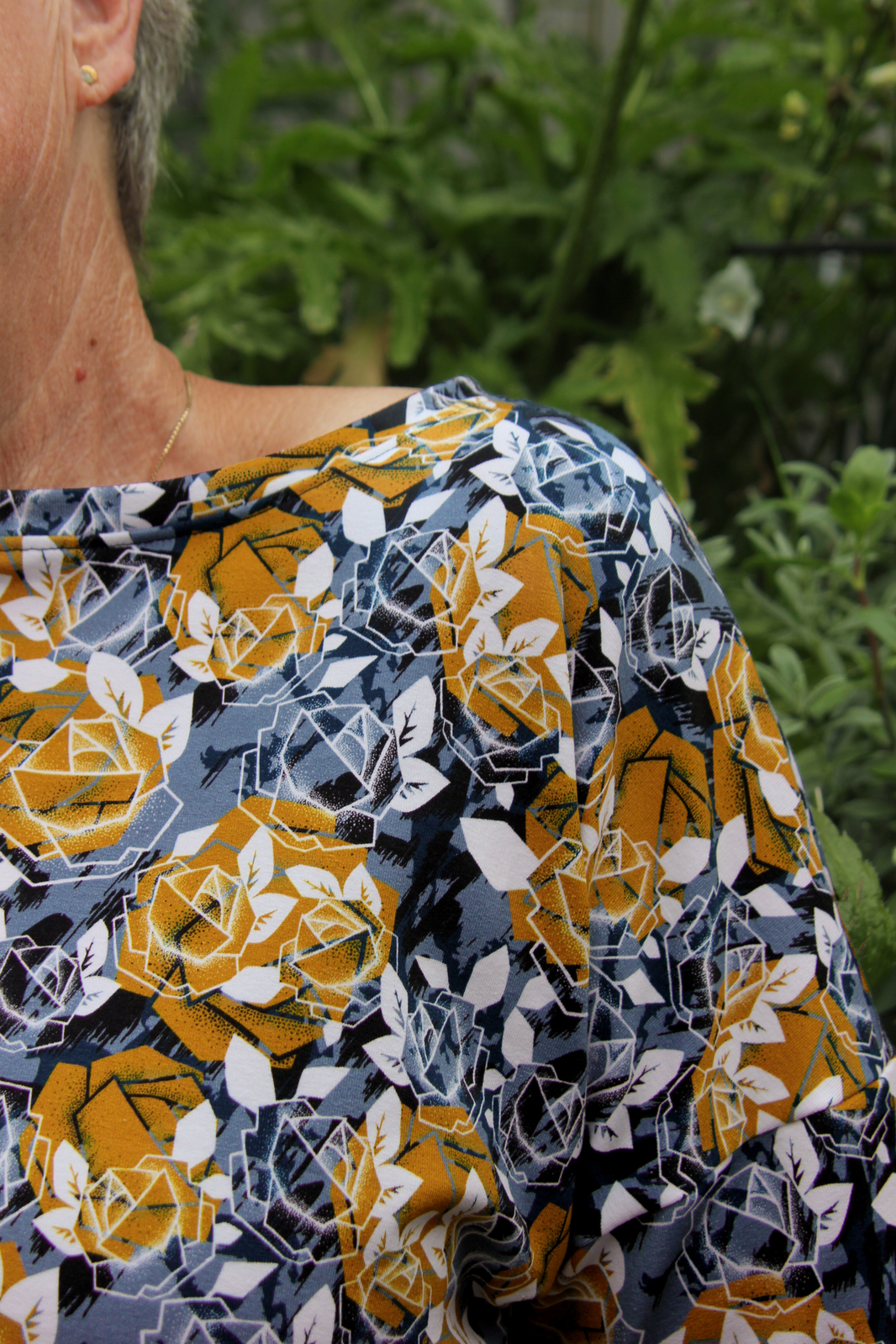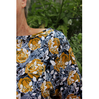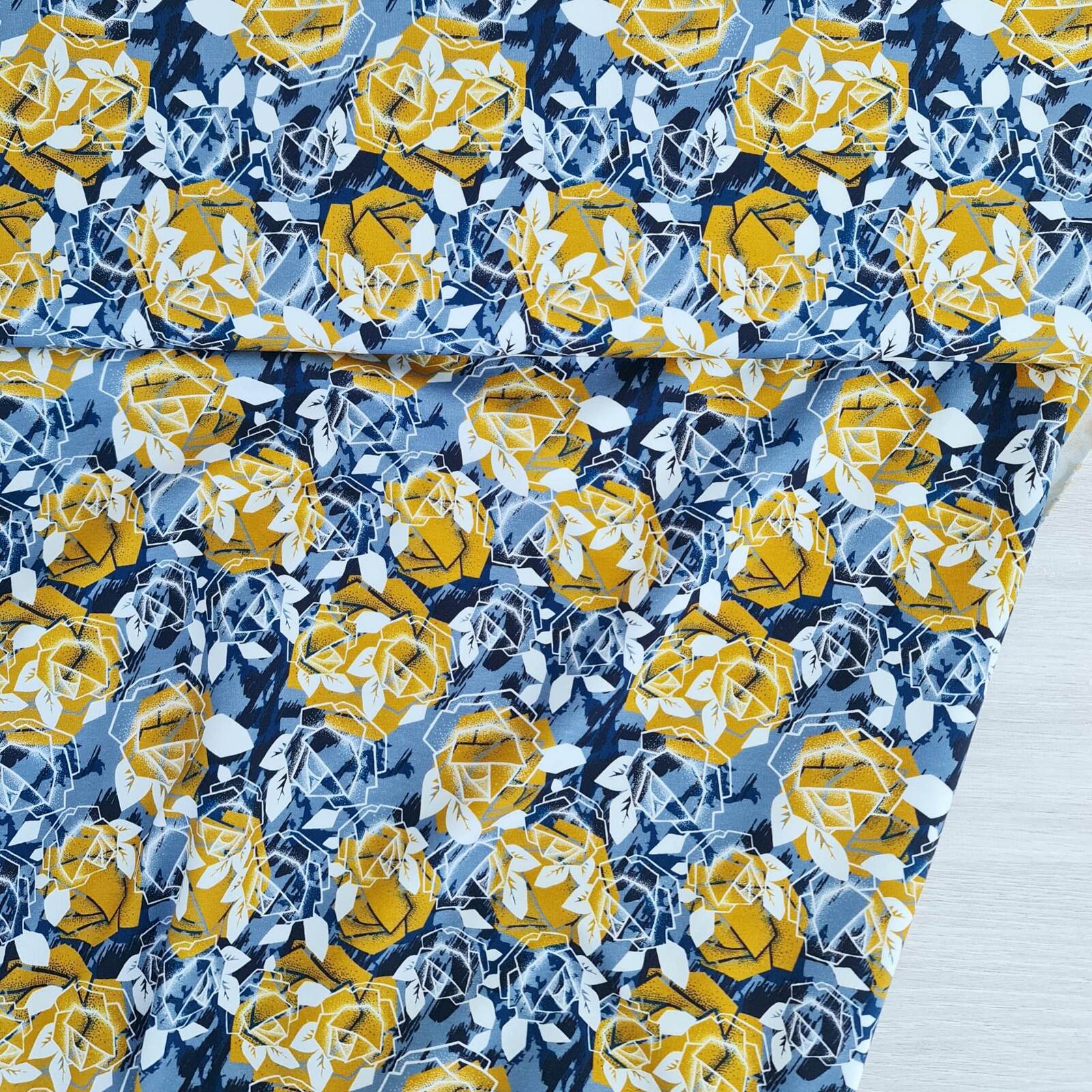*REMNANT 93cm* European Knit, Oeko-Tex French Terry, Geometric Roses Blue Grey/Light Ochre