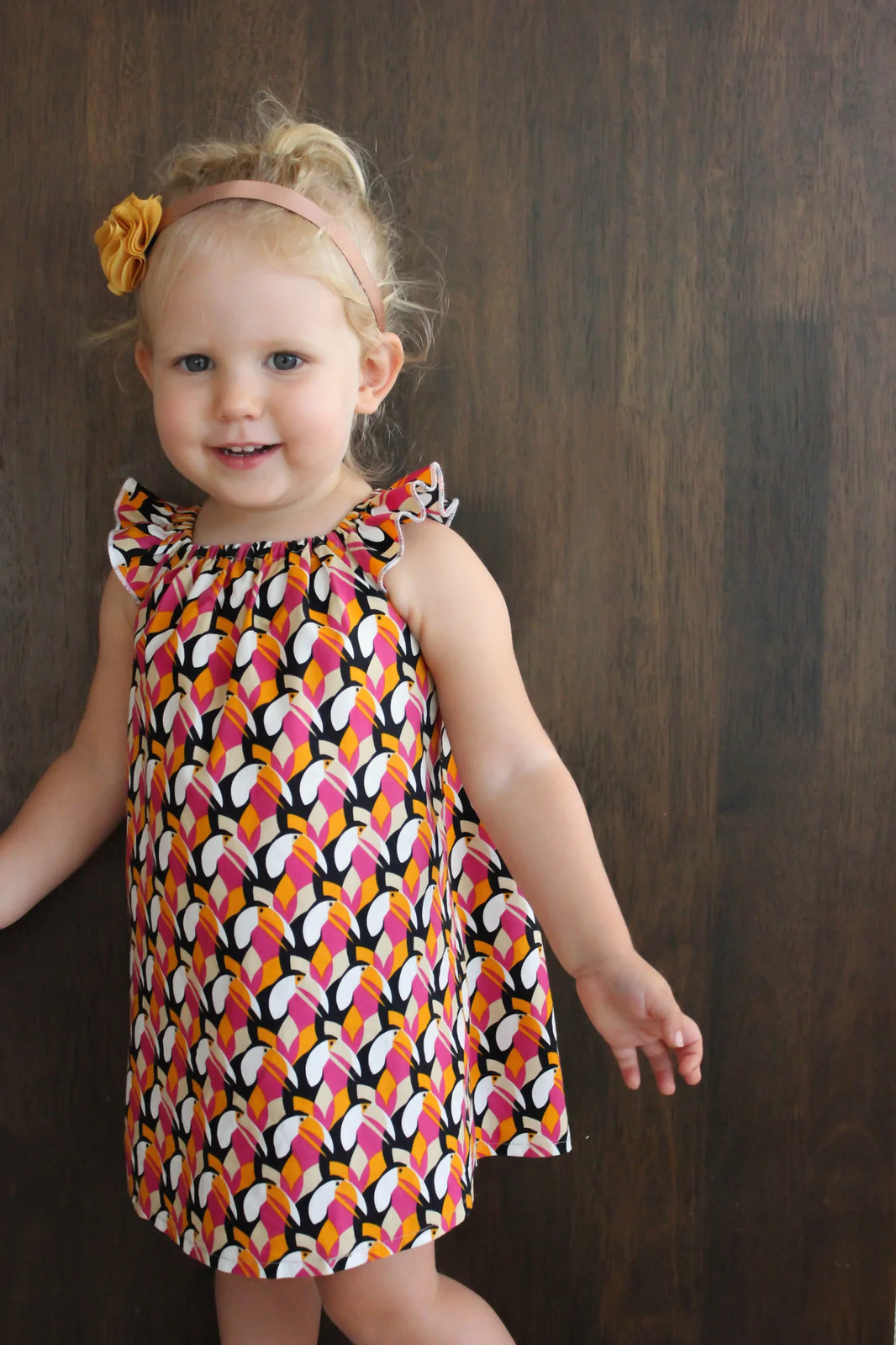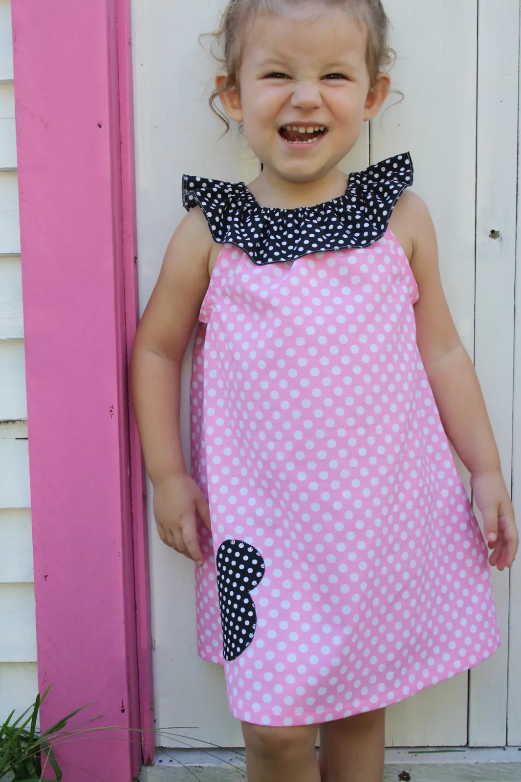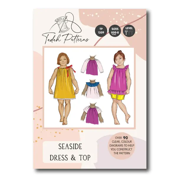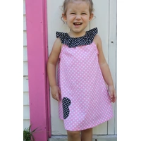 Description: This Seaside Dress and Top pattern offers classy, fresh style for your charming princess. This easy to sew little dress can be made with a ruffle neck, flutter sleeves, short sleeves or long sleeves.
